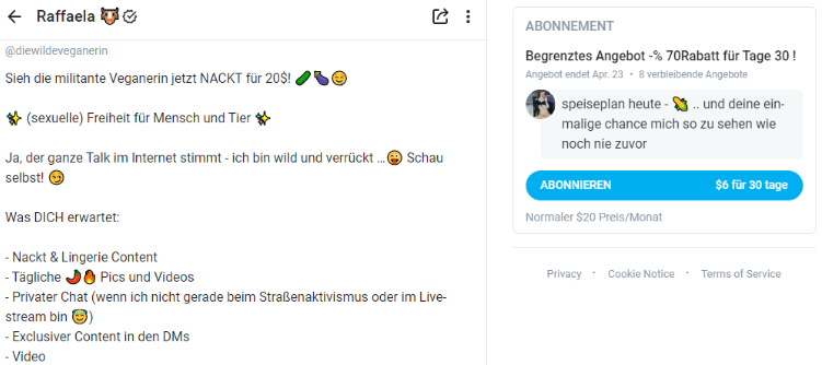 Bild-Copyright: Screenshot vom öffentlichen Teil des OnlyFans-Accounts von Raffaela Raab alias Der Wilden Veganerin, abgerufen am 22.04.2023.