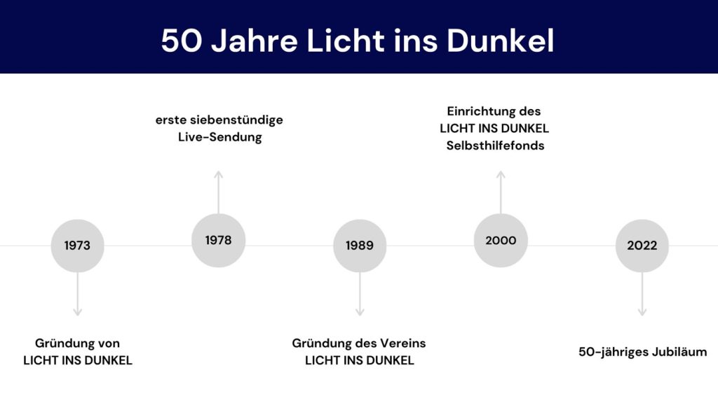 Vor 50 Jahren gründete der ehemalige niederösterreichische Landesintendant Kurt Bergmann die Hilfsaktion „Licht ins Dunkel“. Anlässlich einer geplanten Unterstützungsaktion für die „Lebenshilfe Sollenau“, lief am 24. Dezember 1973 eine einstündige Sendung im Radio Niederösterreich, mit der insgesamt 33.854,- Schilling (2400,- Euro) gesammelt werden konnten. Das Konzept ging auf und fünf Jahre später wurde die erste, siebenstündige Live-Fernsehsendung „Licht ins Dunkel – Feiern und Helfen“ ausgestrahlt wurde. Ein weiterer Meilenstein erfolgte rund zehn Jahre später, durch die Gründung des Vereins LICHT INS DUNKEL. Dieser gab der Aktion Struktur und eine rechtliche Grundlage.. Im Jahr 2000 kam ein Soforthilfefond dazu, der sich auf Einzel- und Kathastrophenfälle spezialisiert, um Gelder gezielt und schneller einsetzen zu können. Insgesamt 360 Milliionen Euro sammelte LICHT INS DUNKEL seit 1973.
