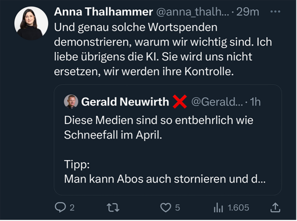Die Kontrolle über tagesaktuelle Nachrichten hat jedoch nur der Journalismus. Die KI kann immer nur auf bereits bestehende Daten zugreifen, keine neuen erschaffen oder diese weiterentwickeln. Für Medienhäuser gilt es allerdings jetzt schon, sich mit KI zu befassen, denn: Ohne Fortschritt und ohne Entwicklung und mit denselben Einnahmequellen wie Jahrzehnte davor, wird es weiterhin zu Personalabbau kommen, wie Ende Februar zum Beispiel, bei der Kleinen Zeitung kommen. Um nicht unter Kontrolle der KI zu gelangen, soll es also künftig heißen: Mutig und offen in die Zukunft, statt Kulturpessimismus und Stagnation.