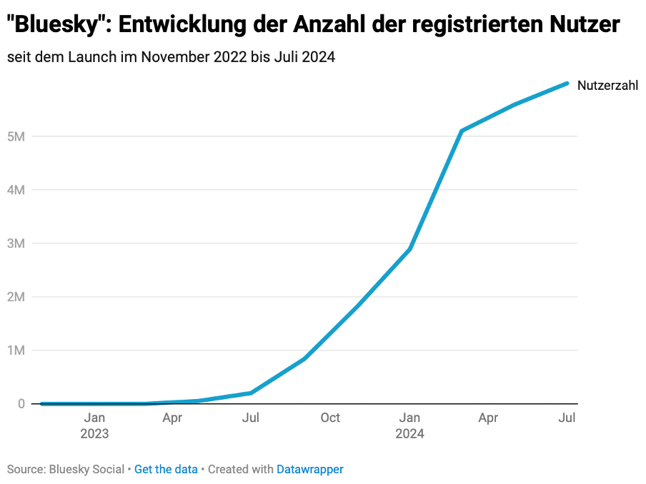 Es sind auf den ersten Blick beeindruckende Zahlen, die die Social-Media-Plattform Bluesky dieser Tage schreibt: Mit Anfang Juli 2024 kratzen die Nutzerzahlen des Twitter-Ablegers an der Sechs-Millionen-Marke. Seit November 2022, als man sich erstmals auf der Plattform registrieren konnte, sind das bis Juli 2024 circa 10.000 neue User pro Tag.