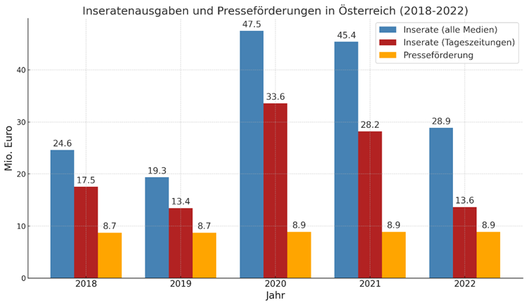 Den Höhepunkt an Inseratenausgaben lieferte jedoch die Regierung unter Sebastian Kurz im Jahr 2020 mit 47 Millionen Euro. Aus einer Studie des Medienhauses Wien geht zudem hervor, dass Sebastian Kurz bei einer parlamentarischen Anfragebeantwortung erstmals offiziell erklärte, dass die Inseratenausgaben der Bundesregierung auch als Printmedienförderung betrachtet wurden. Eine Studie der Uni Wien aus 2023 belegte zudem einen erheblichen Anstieg der Medienpräsenz des ehemaligen österreichischen Bundeskanzlers innerhalb der Medien, die verstärkt finanziell gefördert wurden. Transparenter und unabhängiger Journalismus lässt sich unter solchen Bedingungen nicht vereinbaren. Drei Jahre später wurde im Zuge einer Verschärfung des Medientransparenzgesetzes erstmals ein Umdenken in dieser Angelegenheit angestrebt.