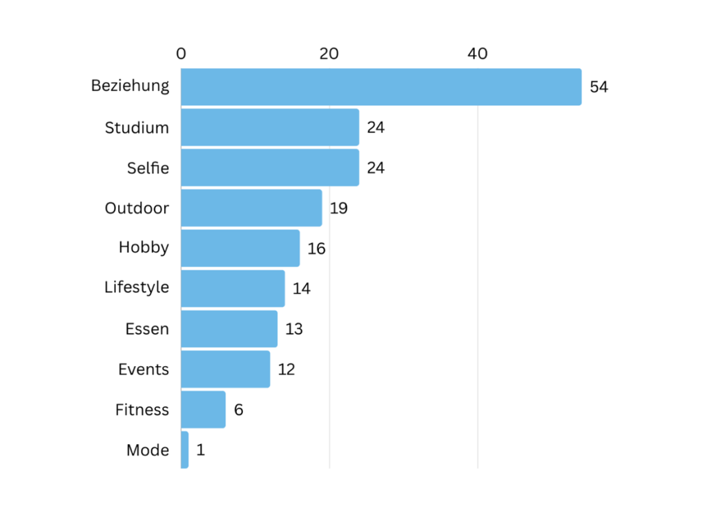 Aus jener Analyse konnten mehrere zentrale Schlussfolgerungen gezogen werden. Besonders auffällig ist der hohe Stellenwert, der Beziehungen, mit 54 Postings im Beobachtungszeitraum, zugeschrieben wird. Auch Studium und Selfies, mit je 24 Postings, scheinen beliebter Content zu sein, diese untermalen beide ein Bild der Selbstinszenierung und Eigendarstellung, um aufzuzeigen, wie man gerne wahrgenommen werden möchte. Um diese These fortzuführen, auch die Lebensgestaltung wird fleißig geteilt. Die Kategorien Outdoor, Hobby, Lifestyle, Essen und Events bewegen sich allesamt im Rahmen von 12-19 Posting in der Beobachtung. Vergleichsweise wenig Aufmerksamkeit bekommen Fitness und Mode, bloß sieben Mal wurde insgesamt von diesen Themen gepostet.