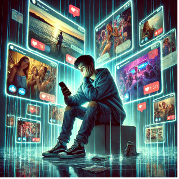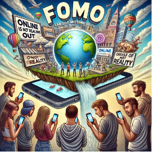 FOMO zeigt sich vor allem bei Jugendlichen – soziale Medien verstärken das Gefühl, ständig etwas zu verpassen.“ Erstellt mit „ChatGPT-4“ am 1.12.2024, 17:55; Prompt: „Generiere mir ein Bild, das FOMO verbildlicht.“